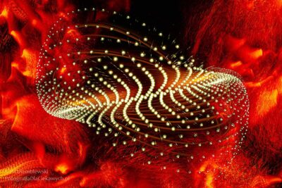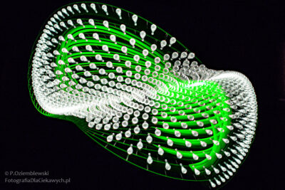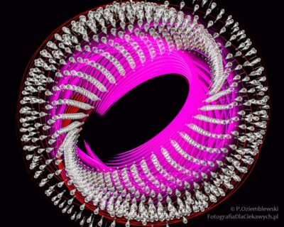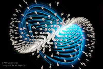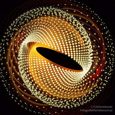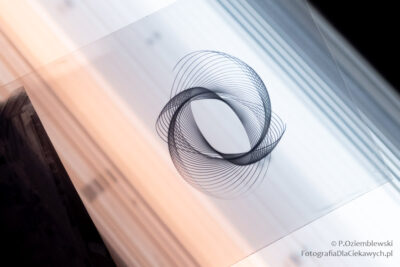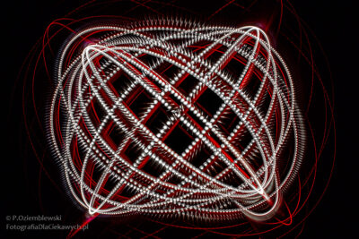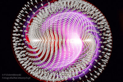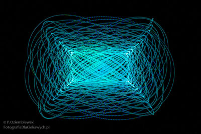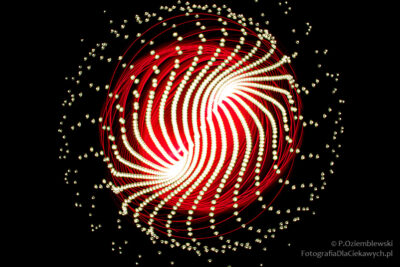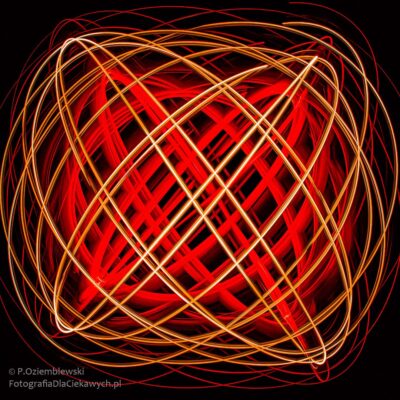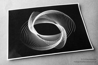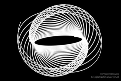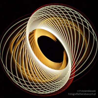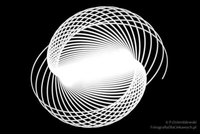 Możesz też nakładać na siebie krzywe. Np. puszczasz w ruch wahadło, naświetlasz kadr przez kilkanaście sekund, zakrywasz obiektyw, puszczasz znowu wahadło, ale już w innym kierunku, odsłaniasz obiektyw i dalej naświetlasz przez kolejne sekundy. Później zamykasz migawkę i masz dwie spirale na jednym zdjęciu.
