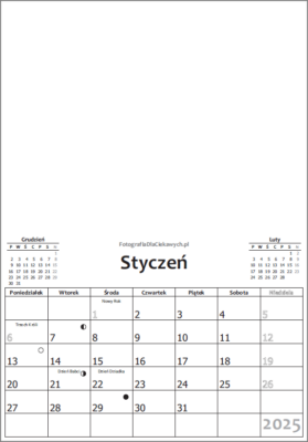Układ pionowy z wolną przestrzenią na własną twórczość (grafikę, zdjęcia, plany, cele), święta, fazy księżyca, czytelna czcionka cyfr, dni tygodnia, kalendarz miesięczny, rok 2025.