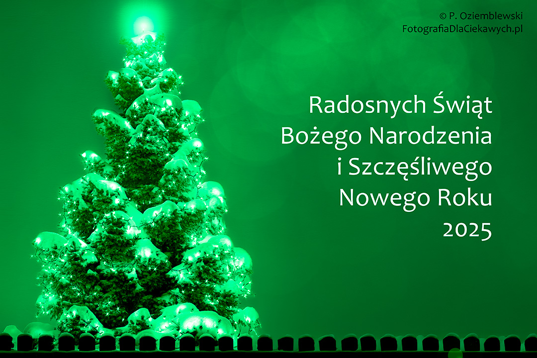 PS Zastanawiałem się, czy jako ilustrację do życzeń wykorzystać zrobione przez siebie zdjęcie, czy może już czas na korzystanie w pełni ze sztucznej inteligencji. Zrobiłem więc dwa obrazki. Pierwszy, górny, ze zrobionego zdjęcia ośnieżonej choinki na tle ściany. Zmieniłem jednak jego kolorystykę na zieloną, dodałem przestrzeń po prawej stronie na napis oraz efekt bokeh i błysk światła na jej czubku.