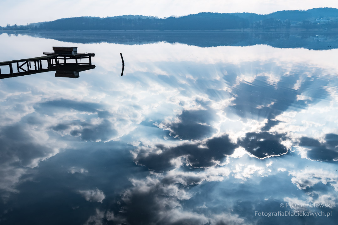 Tafla jeziora w bezwietrzny dzień to prawdziwy skarb. Często bywam nad jeziorem Chodzieskim i gdy tylko woda jest spokojna, mogę złapać w niej odbicie podświetlonego nieba, czy chmur. Żeby takie odbicie dobrze wyeksponować, stosuję czasami filtr polaryzacyjny oraz dodatkowo filtr szary połówkowy. Tym drugim przyciemniam górną część kadru z niebem – bez tego odbicie w wodzie byłoby ciemniejsze i słabiej widoczne.